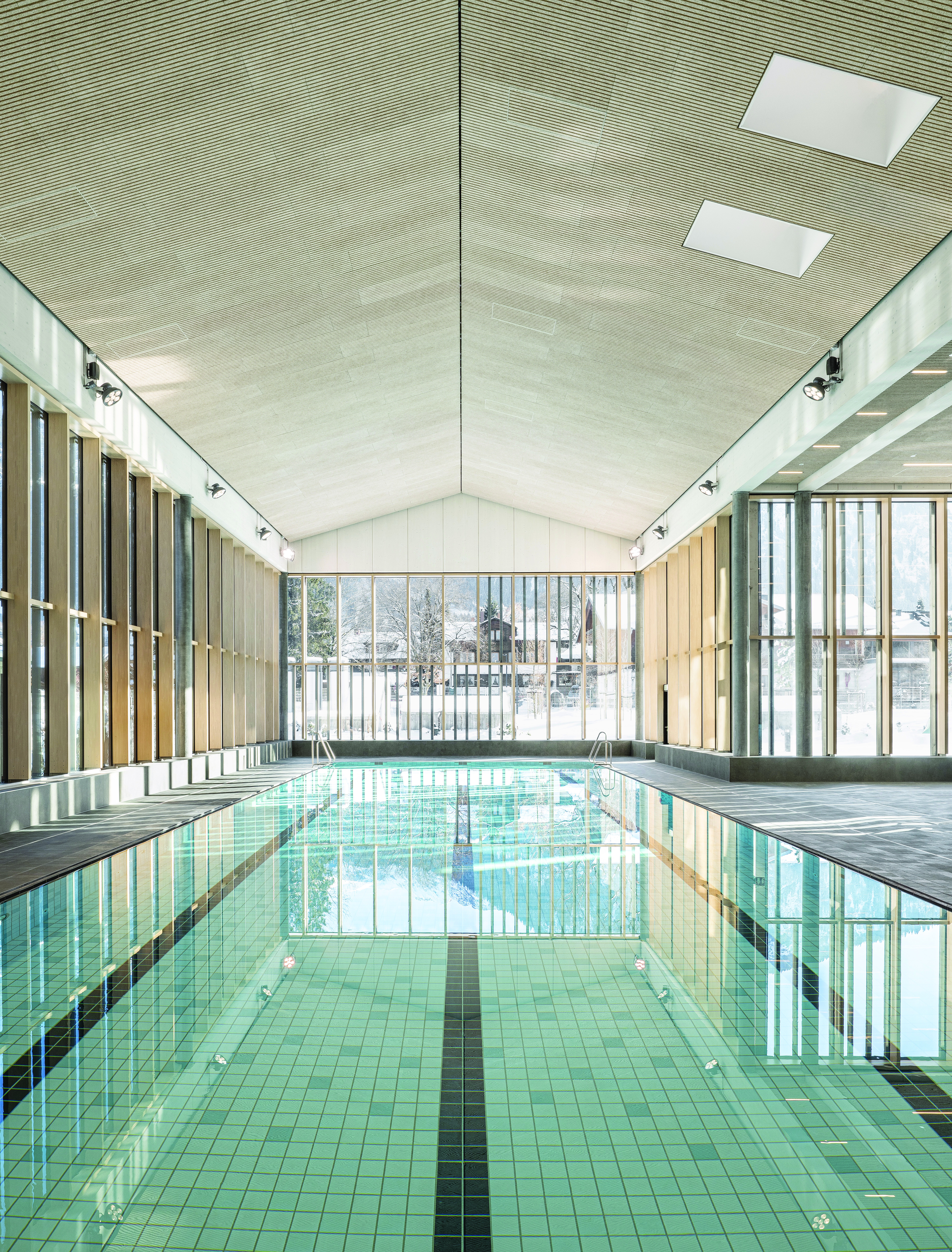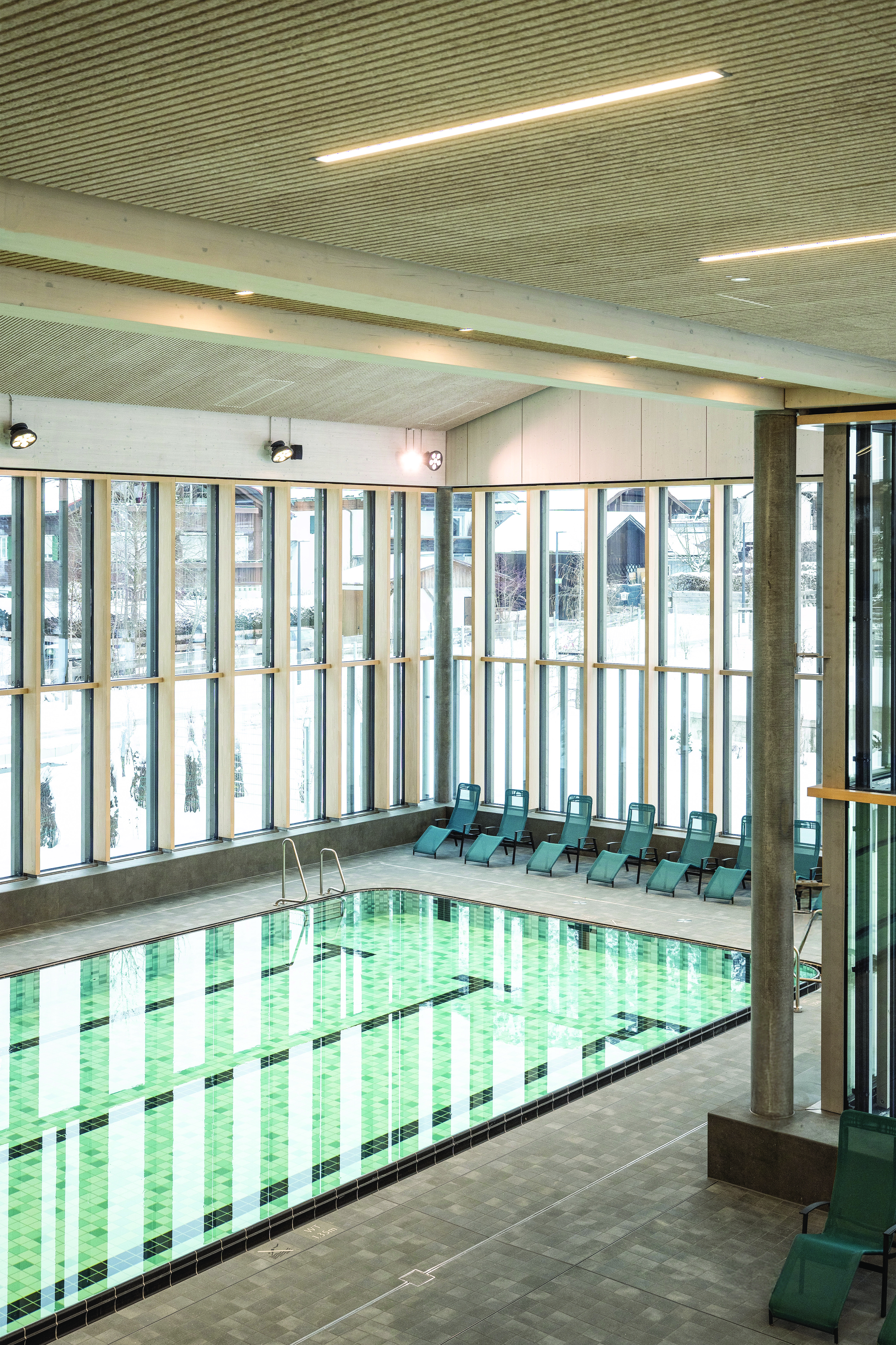 Architecturally, the new building is conceived as an ensemble of several staggered structures, whose sloping roofs and minimalist design language draw on regional building traditions and translate them into contemporary architecture. The building volumes vary in height and length, thereby responding to the surrounding development and the topography of the site. The generously glazed swimming hall forms the spatial centre of the complex. Here, wood, concrete and glass combine to create a calm, clearly structured interior design that deliberately directs the gaze towards the landscape and water. Different recreational zones – from sports-oriented pools and relaxation areas to the sauna complex – are spatially interconnected yet organised in a differentiated manner.