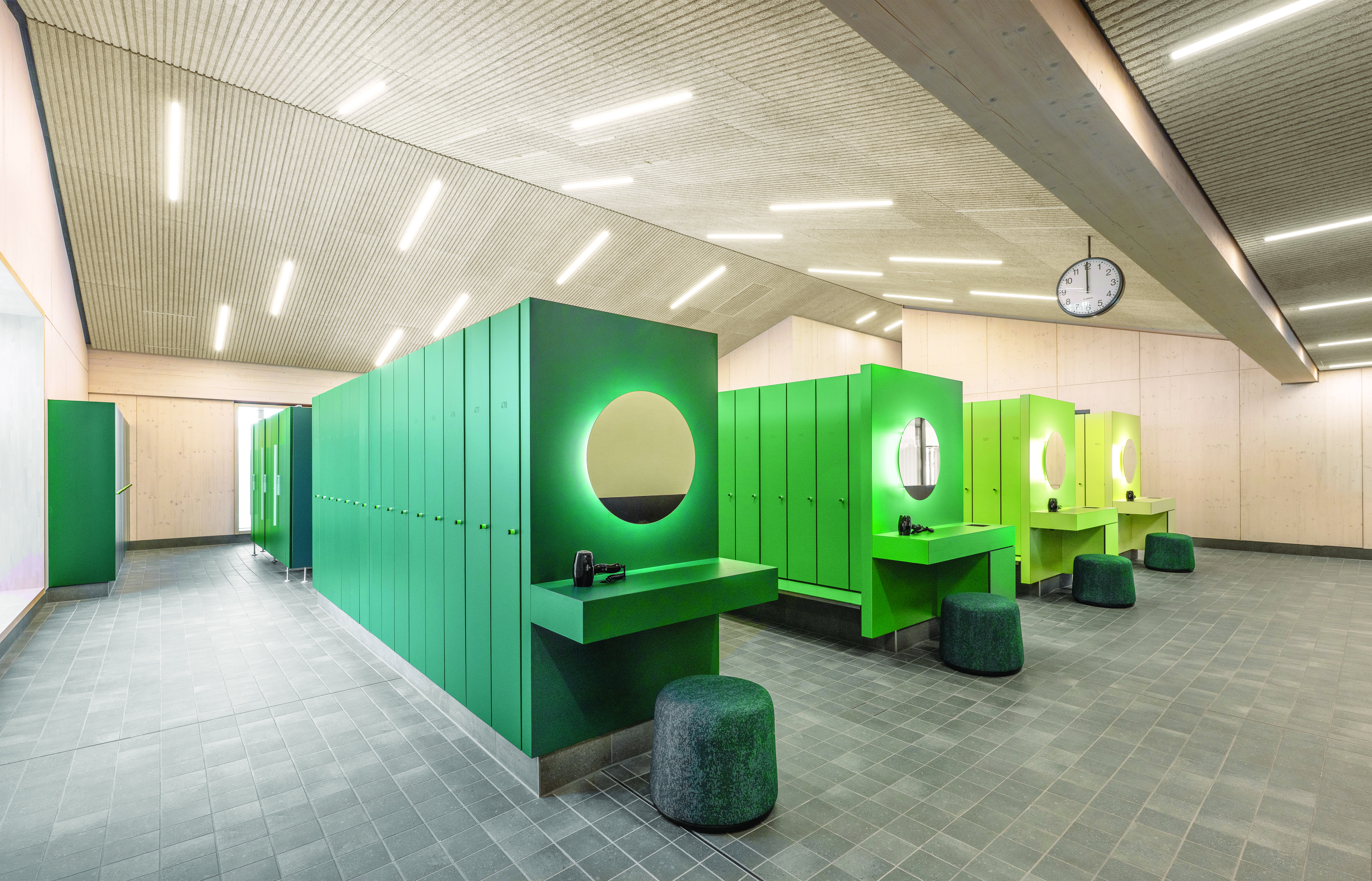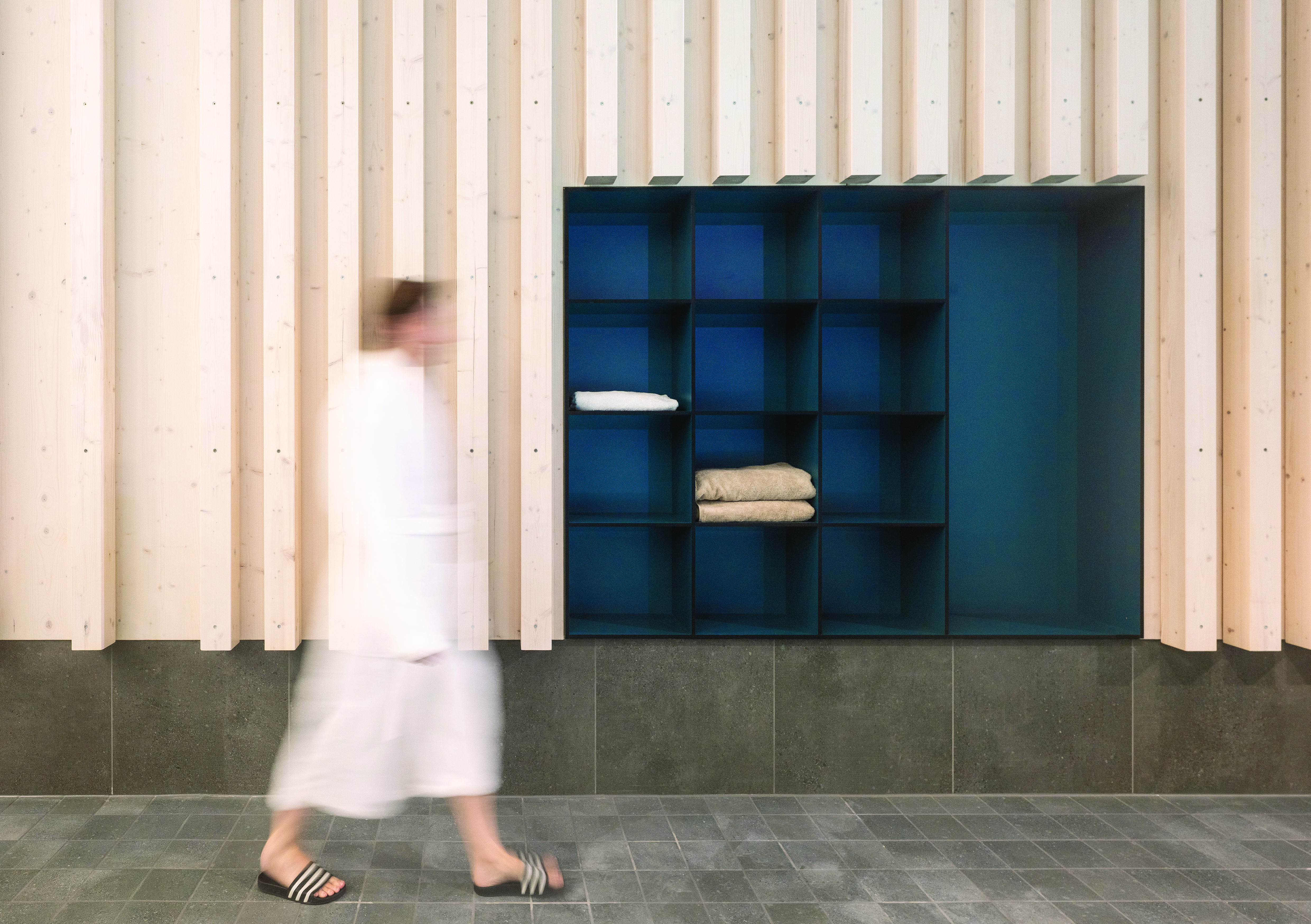 In the design of the baths, colors and materials form a cohesive whole that is closely aligned with the atmosphere of the surrounding natural environment. The landscape characteristics of the Allgäu region are translated into a spatial concept that runs through the entire building. The idea of the four elements serves as a leitmotif, reflected in the distinct material and color schemes of the various functional areas.